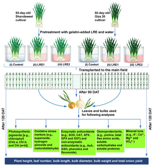Before transplantation to the field, 50-day-old onion bulbs of both cultivars were coated with LRE1 and LRE2 by immersing them in gelatin-added LRE1 and LRE2 solutions for a period of 30 min. The control seedlings of each cultivar were coated with LRE-free gelatin solution. The randomized complete block design with three replicates with an area of 10.5 m2 (3.5 m × 3 m) for each plot was used in this study. Notably, the seedlings of each cultivar were transplanted on ridges at a spacing of 45 cm between two ridges and 10 cm from plant to plant. Light irrigation once a week was applied for optimal bulb development and boost in yield and quality of the produce. It is worth noting that the irrigation was completely stopped prior to 20 days of harvesting to dry up the outer scale and enhance the shelf life of the onion. Additionally, weeding was done regularly to keep the field free from weed infestation. Nonetheless, at 90 DAT in the year 2016, leaf and bulb samples of each cultivar were collected according to different treatment combinations for quantification of the various physiological and biochemical attributes. A schematic representation of the total experimental outline is presented in Figure 7.