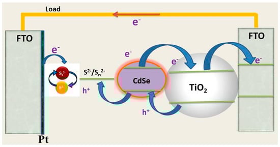 - The S2−/Sn2− strongly obstructs the hole movement from CdSe QDs into the electrolyte [27] as described in Equation (4) and S−* is in an excited ion.