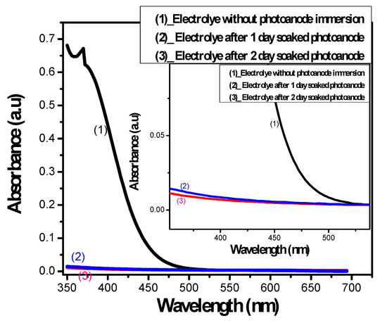 As can be seen in Figure 2, the absorption of the electrolyte was dramatically decreased after 2 days of immersion. This proves the large influence of the electronic exchange reactions between CdSe QDs and the electrolyte, as generated byproducts from Equations (1)–(4) impaired the electrolyte absorbance and reduced the QDSSCs’ PCE.