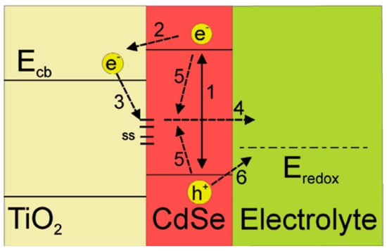 A typical structure of QDSSCs includes the photoanode, counter electrode, and polysulfide electrolyte. Under the light condition, the operated processes happening inside QDSSCs are shown in Figure 3. These processes are indicated by arrows. When the photoanode surface is illuminated, exciton generation and electron–hole recombination are exhibiting simultaneously inside CdSe QDs (1). Free electrons in the conduction band of CdSe QDs are easily transferred to the TiO2 conduction band (2). Those electrons, however, may be trapped in surface states due to CdSe QDs imperfection (3) and diffused into the electrolyte afterward (4), or recombined with holes inside CdSe QDs. The recombination of free electrons in the conduction band (CB) with CdSe QDs surface state and the recombination of electrons in the electrolyte and holes in CdSe QDs valence band (VB) are indicated as (5) and (6) processes, respectively. The (1), (2), and (6) processes are useful in QDSSCs operation. In contrast, the remaining processes cause a reduction in QDSSCs’ performance.