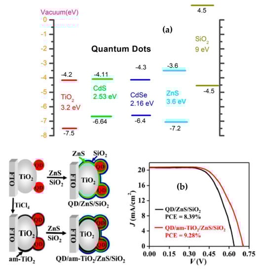 Currently, ZnS has been widely used as the most effective passive surfactant for QDSSCs since this semiconductor has a large band gap of approximately 3.6 eV and CB level (−3.6 eV) of nanocrystal ZnS is higher than that of CdSe (−4.3 eV) and CdS (−4.11 eV), which is studied by Tung et al. and illustrated in Figure 5a. The efficiency was significantly increased by 150% with the presence of a passivation layer. In addition, Tung and colleagues reported an efficiency enhancement from 1.64% to 3.77% on QDSSCs based CdS/CdSe:Mn photoanode and from 1.64% to 4.22% on CdS/CdSe:Cu-based photoanode with the presence of ZnS passivation layer [99,100,101,102]. As reported by Hachiya et al. [95], a significant improvement of excited electron transport from QDs into TiO2 layer and a dramatic reduction of surface trap states at the QDs/TiO2 interface by covering ZnS nanocrystals on PbS QDs were observed and proved by transient grating (TG) spectra. Apart from ZnS, other materials, such as ZnSe [103], Al2O3 [104], or SiO2 [101], have been used as a passivation layer for QDSSCs. According to Tung et al., the QDSSCs efficiency was sharply increased by 375% when a SiO2 passivation layer was absorbed onto the surface of CdS/CdSe QDs. Since SiO2 conduction level in a vacuum (4.5 eV) was much higher than those of CdSe (−4.3 eV) and CdS (−4.11 eV), the dark current was mostly suppressed in QDSSCs leading to the PCE enhancement. Furthermore, the combination of ZnS and SiO2 as a passivation layer has shown promising efficiency in recent studies. The passivation layer of ZnS/SiO2 covered on the surface of CdSexTe1−x QDs, in particular, leads to the significantly increased efficiency from 6.37% to 8.55% [103].