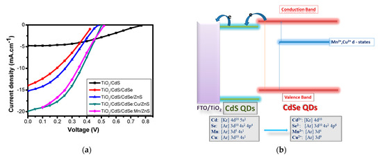 (a) Current density–voltage (J–V) curves of QDSSCs with different photoanodes and (b) schematic diagram of the energy level of a photoanode with CdSe QDs doped Mn or Cu from Phuc, D.H and co-works, 2019 [120].