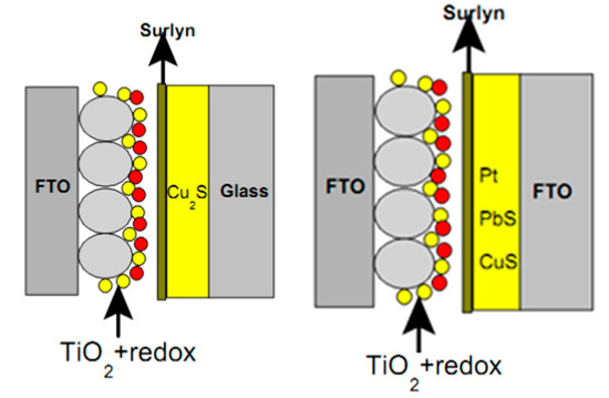 Schematic diagram of QDSSCs’ structure with different counter electrode materials: Cu2S (left) and Pt, CuS, and PbS (right).
