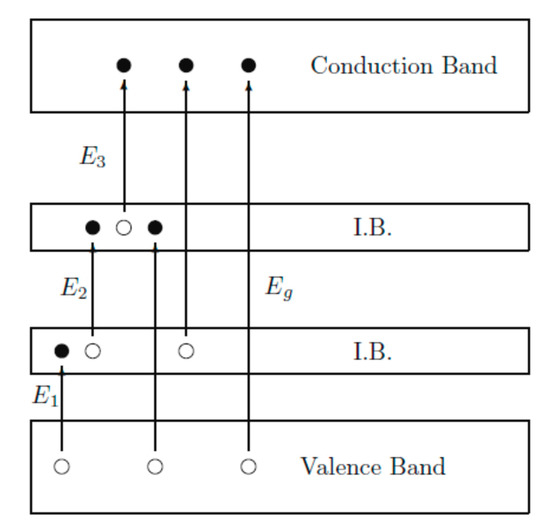 Limitations in traditional solar cells, such as a narrow absorption spectrum of photosensitive materials, leads to the degradation of absorbed photon density, current density, and open circuit potential. Those photons, which have energy larger or equal than the photosensitive material bandgap, are absorbed. For materials with IB structure, this issue is overcome since the material is a compound of two or more materials with different bandgap energies. As can be seen in Figure 11, photons with different energies E1, E2, and E3 are absorbed, corresponding to the energy gap between two VBs of the two materials, valence and CBs of the narrower bandgap material and two CBs of the two materials, respectively. These absorptions result in the enhancement of the excited electron concentration in the CB of a wider bandgap material, which is then collected and transferred to an external circuit and creates the electric current density. These IB structure materials have great potential to replace traditional photosensitive materials due to predicted PCE in QDSSCs up to 46% [150].