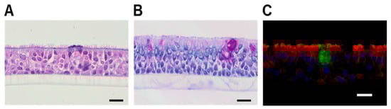 ALI cultures were fixed in 4% buffered formaldehyde for 24 h or with methanol-Carnoy’s solution (Methacarn, 60% methanol, 30% chloroform, 10% glacial acetic acid) for 48 h to preserve mucus []. After paraffin embedding following routine histologic protocols, 2 µm thick sections were cut. These sections were deparaffinized in xylene and rehydrated following standard procedures. From formaldehyde fixed samples hematoxylin and eosin (H&E) stainings were prepared for morphologic evaluation. For periodic acid-Schiff (PAS) staining, sections of methacarn-fixed ALI cultures were deparaffinized, treated with 1% (w/v) periodic acid (Merck, Darmstadt, Germany), then stained with Schiff’s reagent (Sigma-Aldrich Sigma-Aldrich, St. Louis, MO, USA) and counterstained with hematoxylin (Merck).
