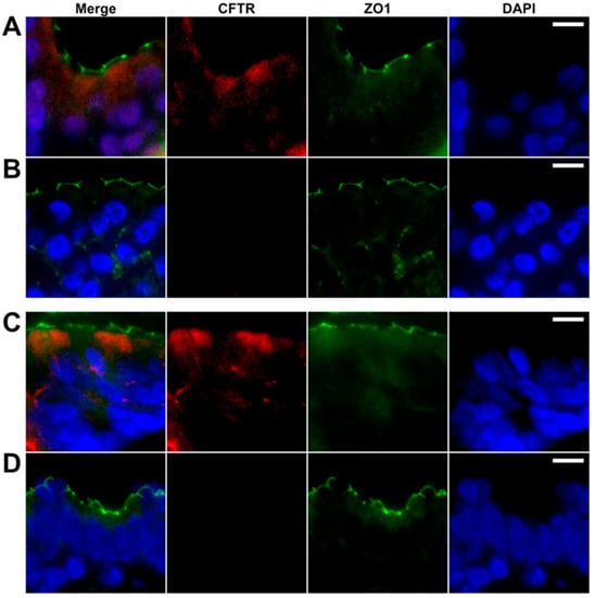 Staining of ALI inserts and human bronchus tissue for CFTR. Formalin fixed and paraffin embedded, primary bronchial epithelial cell ALI inserts (A,B) and human bronchus tissues (C,D) were stained with specific antibodies for CFTR (red) and ZO1 (green), and with DAPI (blue). (A) ALI inserts and (C) human bronchus epithelia showed cytoplasmic and membranous staining for CFTR with predominance in the apical compartment along with typical apico-lateral ZO1 positivity. Pre-incubation of the primary antibody with a CFTR specific peptide completely blocked the CFTR signal (B,D) whereas no apparent change occurred in ZO1 reactivity. Scale bars are 10 µm, respectively.