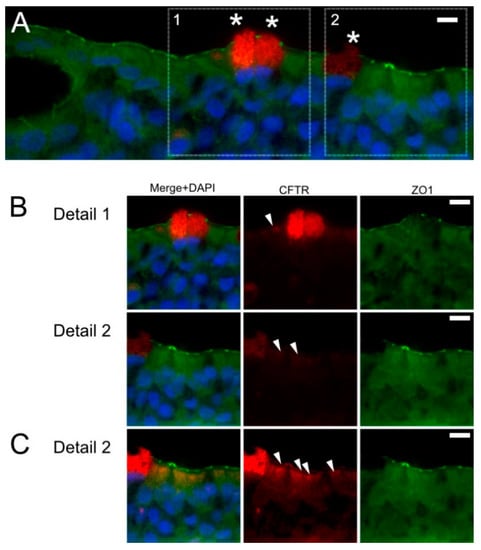 Differential CFTR staining in human epithelial ALI inserts. Sections of formalin fixed and paraffin embedded epithelial cell ALI cultures were double immuno-stained for CFTR (red) and ZO1 (green). Cell nuclei were visualized with DAPI (blue). (A) A small number of cells with a high CFTR content was detected (*). (B) When adjusting brightness and contrast to include these CFTR-high cells, the typical apical signal in the other epithelia was barely seen (arrowhead). (C) After linear adjustment of brightness and contrast, we were able to observe CFTR positive cells. Cell nuclei were visualized with DAPI (blue). Scale bars are 10 µm.