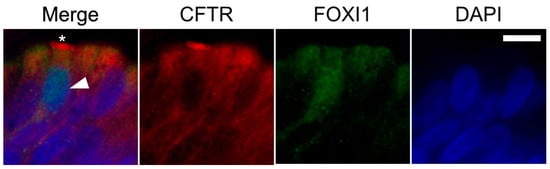 Human bronchial epithelial cell staining for FOXI1/CFTR. Sections of formalin fixed and paraffin embedded human bronchus were immunostained for CFTR (red) and FOXI1 (green). Cell nuclei were visualized with DAPI (blue). Rare cells with nuclear positivity for FOXI1 (arrowhead) and intense apical positivity for CFTR (*)–compatible with pulmonary ionocytes-could be observed. Scale bar is 10 µm.