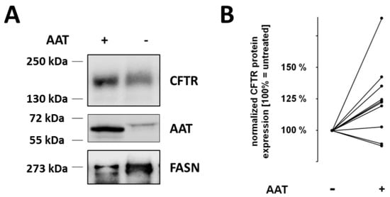 Increased CFTR expression in T84 cells treated with AAT. (A) T84 cells were incubated overnight alone or in the presence of AAT (0.5 mg/mL). SDS-rich whole cell lysates were prepared and separated on a denaturing 6% polyacrylamide gel at 4 °C for 18 h until the 72 kDa size marker band approached the end of the acrylamide matrix. Electrophoretically separated proteins were transferred to nitrocellulose membrane and the CFTR was detected by using a mixture from four monoclonal anti CFTR antibodies (1:1:1:1). As a loading control, we used FASN (Fatty Acid Synthase). We show a representative blot from one out of ten different experiments. (B) Densitometry analysis of Western blot data. Values were normalized to the control (no treatment with AAT) whereby control and AAT-treated samples were derived from the same experiment. As such, the control and AAT-treated samples technically represent pairs. The signal in the untreated controls was defined as 100% and changes upon AAT-treatment are reflected by the deviation from 100%, whereby in eight out of ten cases an increase of CFTR expression was observed (p = 0.02, n = 10, Wilcoxon signed rank test).