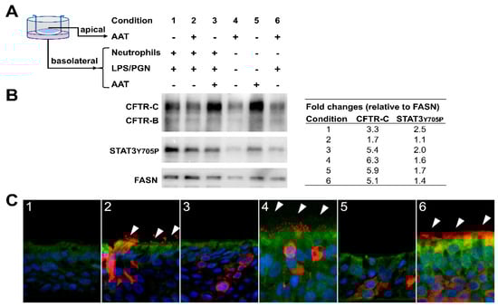 Next, we assessed the ability of AAT to affect CFTR levels in primary bronchial epithelial ALI cultures at baseline or when cells were activated with pro-inflammatory stimuli. The AAT concentration was selected based on the assumption that in the epithelial lining fluid of the lower respiratory tract AAT constitutes about 10% of plasma levels, which are 1–2 g/L []. We added AAT (0.5 mg/mL) to the ALI culture on the top chamber representing the surface of epithelial cells (apical) or into the culture medium (basolateral)- either alone or together with pro-inflammatory stimuli, such as lipopolysaccharides (LPS) and peptidoglycan (PGN) or LPS/PGN plus freshly isolated human blood neutrophils (Figure 7A). Dependent on the mode of application, AAT either reduced or enhanced CFTR protein levels in ALI cultures exposed to LPS/PGH or LPS/PGN plus neutrophils, and slightly inhibited STAT3 phosphorylation (Figure 7B). Remarkably, ALI cultures treated with AAT alone showed similar levels of CFTR protein than those exposed to AAT in the presence of pro-inflammatory stimuli. As illustrated in Figure 7C, AAT positive cells (in red) were detected in cultures supplemented with exogenous AAT from the apical (inserts 2, 4 and 6) or basolateral sides (inserts 3 and 5), however this was not the case in the culture without added AAT (insert 1).