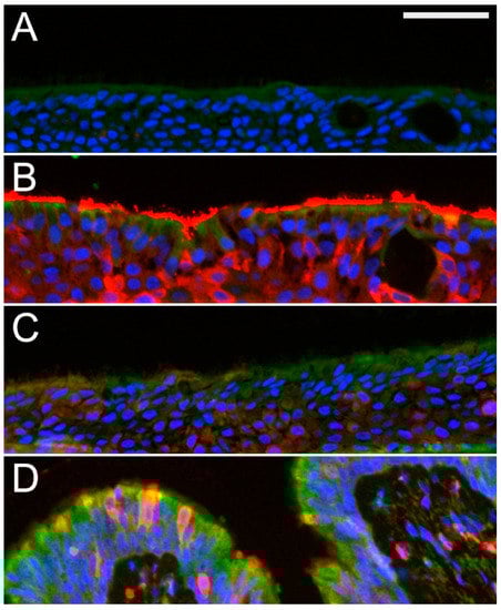 AAT uptake by human bonchial epithelial ALI culture and native human airway epithelium. Combined immunofluorescence for CFTR (green) and AAT (red) highlights typical CFTR positivity in the apical cellular compartment in ALI cultures (A–C) or bronchial epithelium (D). Cell nuclei were visualized with DAPI (blue). In ALI supplemented with 0.5 mg/mL of AAT from the top (B) or the bottom (C), AAT-positive cells are detected. Similarly, AAT positive cells are detected in intact human bronchial epithelium (D). By contrast, no AAT-positive cells are found in cultures without AAT supplementation (A). Scale bar is 50 µm.
