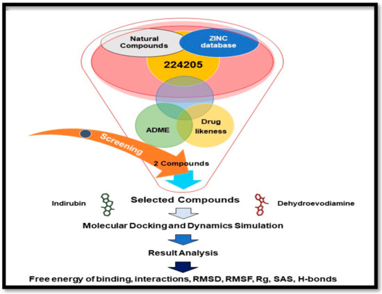 Natural compounds were retrieved from the ZINC database (https://zinc.docking.org, accessed on 15 April 2021) by selecting ‘natural_products’ as a ‘subset’ under the ‘substances’ category. A total of 224,205 compounds were retrieved, downloaded in .sdf format, imported into Discovery Studio 2020, and processed using the ligand preparation tool.