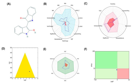 Graphical representation of pharmacokinetic properties of indirubin. (A) 2D structure indirubin, (B) Physicochemical filter positioning of ligand, (C) Complexity of ligand, (D) Golden triangle rule (dot represents the position of compound), (E) Oral absorption, (F) Pfizer rule (dot represents the position of compound).