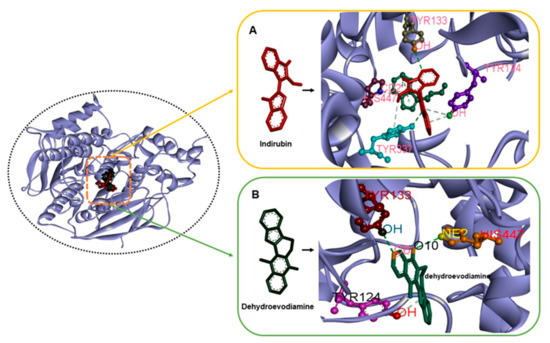 The complex structures of ACHE with indirubin and dehydroevodiamine (A) H-bond interactions in AChE–indirubin. (B) H-bond interactions in AChE–dehydroevodiamine.