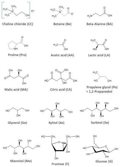 A series of different classes of NADES (acid–base, base–sugar, base–polyalcohol, acid–sugar, acid–polyalcohol, amino-acid–sugar, and sugar–sugar) was prepared for the solubility tests. The compositions (mole ratios) of the components in the NADES were based on our previous studies [1,2], where several different molar ratios of two or three components were tested. Compositions that provided clear liquids (NADES) were used in the present study. Some examples of NADES components are presented in Figure 1. Most of the NADES employed in this study include water as one of the ingredients, as the addition of water influences the solubility of compounds [4,5,35]. Moreover, the presence of a limited amount of water (<40% w/w) generally lowers the viscosity of NADES. The high viscosity is thought to be due to the extensive hydrogen bonds between NADES components, and additional water might break the hydrogen bonding between these components [35,36,37]. For example, addition of 5–20% (w/w) water to some viscous sugar-based NADES greatly decreases their viscosity. High viscosity affects homogenization/solubilization which, for example, can decrease the reaction rate in case of diffusion-controlled chemical reactions [38]. An increase of the amounts of water from 0.4% to 7.8% (w/w) in a low-melting mixture consisting of glucose, urea, and choline-chloride, decreased the viscosity by a factor of 50 [35,38]. A study of the role of inter-molecular and intra-molecular hydrogen bonding and energies in the formation of some choline-chloride based DESs was performed by Zhekenov et al. [12]. The results of the computer simulations showed that addition of water to a mixture of choline chloride and a hydrogen bond donor (HBD) such as urea, ethylene glycol, or glycerol, increased the number of hydrogen bonds between HBD–water, choline ion–water, chloride ion–water, and decreased those between HBD–choline ion, HBD–chloride ion, and HBD–HBD.