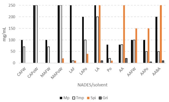 Chloral hydrate and ranitidine·HCl are soluble in both acids and in propylene glycol alone, up till 250 mg/mL. Both compounds dissolved easily in almost all NADES tested. The solubility of the other non-water-soluble compounds (Methyl phenidate, trimethoprim, spironolactone, and griseofulvin) in some selected acid-based NADES are compared in Figure 4 (data extracted from Table 5 and Table 6).