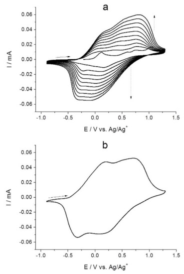 - Visy, C.; Lakatos, M.; Szücs, Á.; Novák, M. Separation of faradaic and capacitive current regions in the redox transformation of poly(3-methylthiophene) with the exclusion of overoxidation processes. Electrochim. Acta 1997, 42, 651–657. [Google Scholar] [CrossRef]