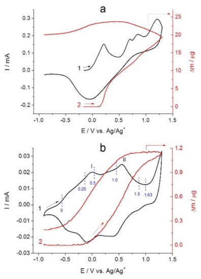 4.2. Cyclic Voltammetry and EQCM Studies