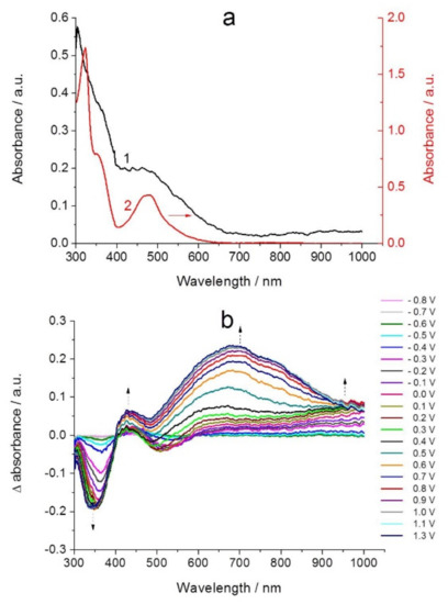 4.4. UV-Vis Spectroscopy and In Situ UV-Vis Spectroelectrochemical Studies