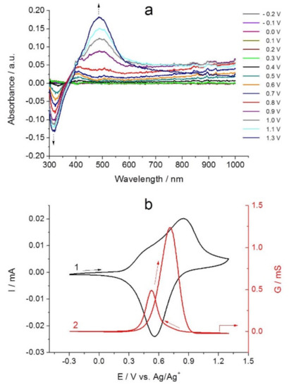 - Yurchenko, O.; Heinze, J.; Ludwigs, S. Electrochemically Induced Formation of Independent Conductivity Regimes in Polymeric Tetraphenylbenzidine Systems. ChemPhysChem 2010, 11, 1637–1640. [Google Scholar] [CrossRef]