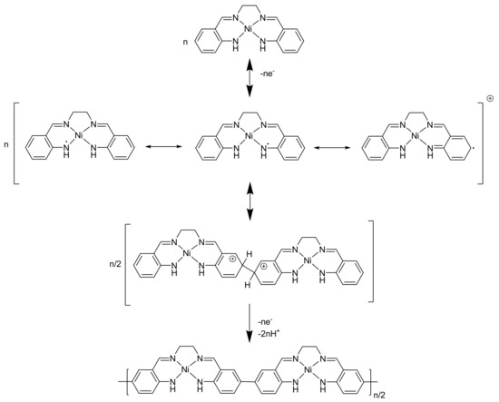 - Shagisultanova, G.A.; Ardasheva, L.P. Electrochemical Polymerization of Ni(II) and Pd(II) Complexes with 1,2-Bis(o-aminobenzylidene)ethylenediamine. Russ. J. Coord. Chem. 2004, 30, 94–99. [Google Scholar] [CrossRef]