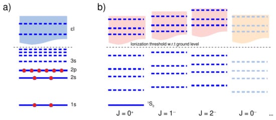 The rotational symmetry and parity of the ASF split each approximate Green function into separate channels (continua) of well-defined symmetry , and as shown in Figure 1b. This figure compares the single- and many-electron spectra (continua) of atoms and ions with complex shell structure and briefly explains the role of the (total) symmetry of the states. Analogue to the one-electron Coulomb-Green function (2), an infinite number of channels generally occur for every atom or ion, and including channels of both parities, . In practice, however, only a few of these channels (continua) are usually relevant for any non-linear interaction process, either because of the symmetry of the underlying interaction operators or due to further limitations in the theoretical description. For the two-photon excitation and ionization of a electron from neon-like ions [,], for example, Figure 1 displays the symmetry channel due to a E1E1 excitation as well as the channel if, in addition, one wishes to account for E1M2 multipole excitations.
