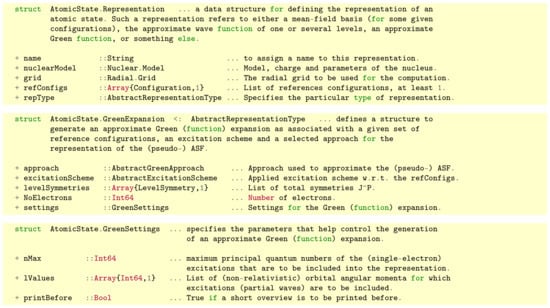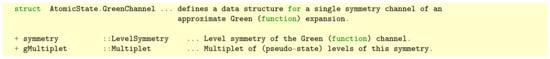 Definition of the data structures AtomicState.Representation (upper panel) to select and specify a representation of an atom or ions, based on a set of reference configurations. One particular representation is the AtomicState.GreenExpansion (middle panel) that specifies an approximate Green function in terms of an excitation scheme and a selected approach for the computation of the (pseudo-) ASF. Finally, the data structure AtomicState.GreenSettings (lower panel) enables the user to control the particular size of the approximate Green function.