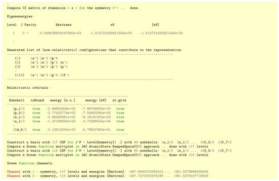 As explained in Section 3.2, here, we just need to provide a name (string), the nuclear model, the (radial) grid parameters and the configurations as general input for all (atomic) Representation’s in Jac. For neon-like ions, we enter the configuration and the Basics.DeExciteSingleElectron() scheme in order to include all excitations of a single electron into subshell with and . This specification makes then use of all orbitals into which virtual excitations are taken into account due to the replacement of a single electron, starting from . We also compute and diagonalize the full Hamiltonian for each channel, as designated by AtomicState.DampedSpaceCI(), but with a convergency-accelerating factor . With this input, the Green function expansion is formally specified and can now be readily generated. Figure 4 shows parts of the output that is printed to screen (or, more precisely, the standard out stream). The program first computes a self-consistent field (SCF) for all levels from the reference configurations, here the ground level of neon-like Ar ions. It then generates (and displays) the list of non-relativistic configurations owing to the given excitation scheme. The SCF also determines the relativistic orbitals from the one-electron (pseudo-) spectra that are taken into account. The computationally most demanding part refers, however, to the set-up and diagonalization of the Hamiltonian matrix that, in turn, is carried out for each channel, and where the concrete number of levels arise from the coupling of the equivalent and non-equivalent electrons. Here, we restrict the CSF basis to quite a moderate size (≥100), although much larger bases could be obtained by increasing or by allowing other one- and two-electron excitations. After the generation of all channels, the variable gChannels contains a list (array) of these Green function channels, and which each provide a multiplet that is suitable for a numerical summation (integration) over the associated many-electron levels as needed for the amplitude (6).