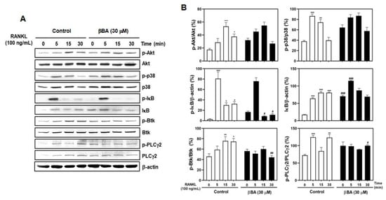 2.3. βBA Suppresses RANKL-Stimulated Activation of NF-κB and Btk-PLCγ2 Signaling Pathway