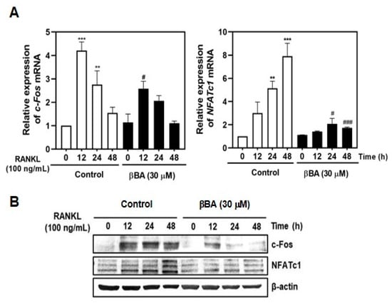 2.4. βBA Downregulates the Expression Levels of c-Fos and NFATc1 Transcription Factor in Osteoclast Differentiation