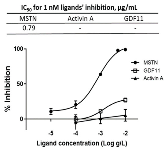 The capacity of CSE mixture of various varieties to suppress MSTN activity was compared to its capacity to suppress GDF11 and Activin A, the molecules closely related to MSTN, using the luciferase reporter assay. The IC50 for MSTN was 0.79 µg/mL, but the IC50 for GDF11 and Activin A were not measurable over the concentration range tested (Figure 2), indicating that CSE’s suppression of MSTN is more specific than its suppression of Activin A or GDF11.