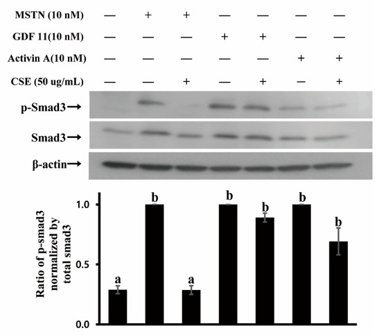 Since CSE demonstrated MSTN inhibitory capacity, we examined whether CSE inhibits MSTN binding to its receptor. MSTN signals through binding predominantly to activin type IIB (ActRIIB) and two type I receptors (ALK4/5) to elicit its biological function [24,25]. The binding of MSTN to ActRIIB recruits and activates type I and type IIB activin receptors, resulting in the phosphorylation of Smad2/3 transcription factors to regulate the expression of downstream target genes, as well as the crosstalk with other signaling pathways [26,27,28]. GDF11 and Activin A are also known to have signaling pathways similar to MSTN, binding to ActRIIB and activating Smad2/3 pathways [29,30]. Thus, the phosphorylation of Smad3 was examined in HepG2 cells treated by MSTN, GDF11, Activin A, with or without CSE. Smad3 was phosphorylated in cells treated by MSTN, and the phosphorylation was suppressed when treated by MSTN with CSE (Figure 3). Both GDF11 and Activin A phosphorylated Smad3 (Figure 3), indicating that MSTN, GDF11, and Activin A have similar signaling pathways. In contrast to MSTN, the phosphorylation of Smad3 induced by GDF11 or Activin A was not inhibited by CSE (Figure 3), demonstrating that CSE inhibits the Smad signaling pathway induced by MSTN but not induced by GDF11 or Activin A. Given that MSTN, GDF-11, and Activin A share the same receptor for their signaling, it appears that the CSE inhibition of Smad3 phosphorylation is via CSE binding to MSTN but not via CSE binding to its receptor, ActRIIB.