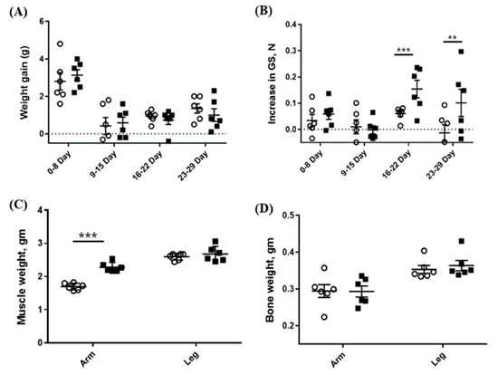 On day 29, after grip strength measurement, mice fasted for 12 h. After fasting, mice were anesthetized with an intramuscular injection of Zoletil 50 (Virbac, Carros, France; 10 mg/kg), and blood was collected by cardiac puncture. Serum was prepared by centrifugation at 890× g for 15 min at 4 °C and stored at −70 °C until use. After blood collection, the skin was peeled off; then, forelimbs and hindlimbs were disarticulated from scapula to carpus and from ilium to medial malleolus, respectively. The weight of forelimbs and hindlimbs were immediately measured, and the bones were removed immediately from the forelimb and hindlimb and weighed and frozen in liquid nitrogen, then stored at −70 °C until use. The muscle weight was calculated by subtracting the bone mass from the weight of the forelimbs and hindlimbs.