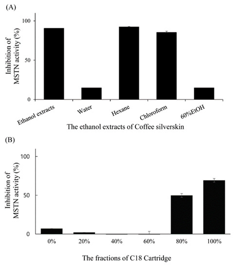 This study was designed to identify compounds that are capable of suppressing the activity of MSTN from coffee bin extract. Our results show that ethanol extracts of coffee silverskin (CSE) suppressed MSTN activity, and its administration to mice increased muscle mass and grip strength along with a decrease in blood fatty acid concentration. βN-arachinoyl-5-hydroxytryptamide (C20-5HT) and βN-behenoyl-5-hydroxytryptamide (C22-5HT) were identified as the active constituents of CSE suppressing MSTN activity.