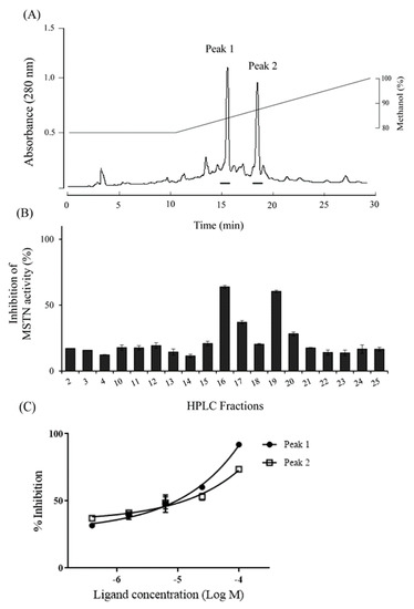 Reversed-phase HPLC of the 100% methanol fraction showed two peaks (Fractions 16 and 19) with MSTN-inhibitory capacity (Figure 7a,b), and the inhibitions were dose-dependent (Figure 7c).
