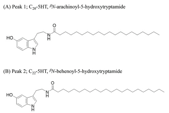 In the electrospray ionization mass spectrometry spectrum (ESIMS), peak1 (fraction 15) showed a protonated [M + H]+ ion at m/z 471.4. The 1H NMR spectrum of peak1 evidenced the presence of a long alkyl chain due to characteristic signals (δH 0.92 and 1.30), three aromatic protons (δH 7.16, 6.95, and 6.67), an olefinic proton (δH 7.02), and two methylene protons (δH 3.46 and 2.88). The UV spectrum of peak1 was similar to those of 5-hydroxytryptamine with the UV absorption patterns at 280 and 300 nm. Additionally, the spectroscopic data comparison between observed and previously reported data further confirmed that the peak1 is βN-arachinoyl-5-hydroxytryptamide (C20-5-HT) (Figure 8a and Figure S3). The NMR data of the peak2 were similar to those of βN-arachinoyl-5-hydroxytryptamide, but the ESIMS showed a molecular ion peak at m/z 499 ([M]+), which exceeded that of the latter compound by 28 amu. Additionally, the 13C NMR spectrum of peak2 gave additional methylene signals at δC 28.4−29.7, in comparison with that of βN-arachinoyl-5-hydroxytryptamide. Thus, the structure of the peak2 was elucidated as βN-behenoyl-5-hydroxytryptamide (C22-5-HT) (Figure 8b and Figure S4).