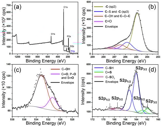 X-ray photoelectron spectroscopic (XPS) measurements were carried out using a VG-220IXL spectrometer with a monochromated Al Kα radiation (1486.6 eV, line width 0.8 eV). The pressure in the analyzing chamber was kept at the level of 10−9 torr while recording the spectra. The spectrometer has the energy resolution of 0.4 eV. All the binding energies were corrected with reference to C(1s) at 284.6 eV. Deconvolution of the spectrum was done using the CASA software with the accuracy of 0.2 eV. Shirley background was used for the deconvolution. For the high-resolution C1s XPS spectrum was deconvoluted into the following three components: C–C (sp2- and sp3-hybridized peaks at 284.7 and 285.4 eV, respectively) [24], C–S (285.3 eV), [28] and C–O (hydroxyl or ether peaks at 286.5 eV) [43]. Carbon atoms with the C–S bond were not separately treated because the C1s binding energy of C–S (285.3 eV) is too close to that of C–C (sp3-hybridization) and thus could not be resolved, given the resolution of the XPS instrument (0.4 eV). The high-resolution O1s XPS spectrum was presented with the following oxygen functional groups: P=O (531.7 eV), [44] and/or oxygen binding energy in sulfonic functional group (531.2~532 eV), [45] as well as C-OH (532.7 eV) [28]. The high-resolution S2p spectrum was deconvoluted with three functional groups: C=S (S2p3/2 at 162.0 eV with FWHM of 1.4 eV; S2p1/2 at 163.2 eV with FWHM of 1.4 eV), C–SH (S2p3/2 at 164.0 eV with FWHM of 1.2 eV; S2p1/2 at 165.2 eV with FWHM of 1.2 eV), [46] and C-SO3H (S2p3/2 at 167.5 eV with FWHM of 1.4 eV; S2p1/2 at 168.7 eV with FWHM of 1.4 eV) [47]. The area ratio and splitting energy difference between S2p3/2 and S2p1/2 spin-orbit doublet peaks were 2:1 and 1.2 eV, respectively.
