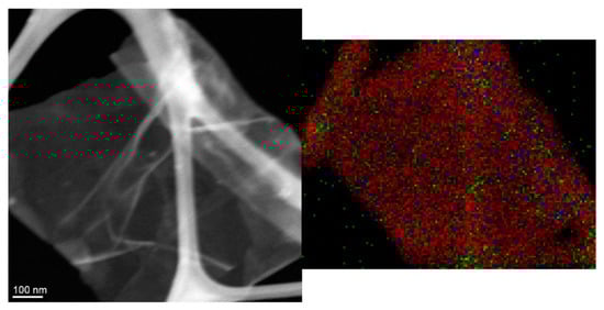 Figure 4. STEM-EDS elemental mapping image of mRGO, red, green, and blue dots indicate carbon, sulfur, and oxygen atoms, respectively.