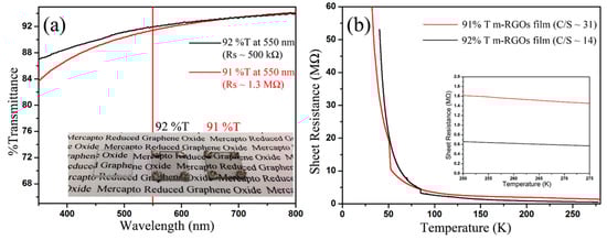 In order to examine the electrical properties of mRGOs, the mRGO-180 Langmuir-Blodgett (LB) film was fabricated by transferring mRGO Langmuir film prepared without using a Langmuir-Blodgett trough in a self-assembled manner by dripping mRGO dispersion in ethanol onto the water surface. The SEM of the mRGO LB film in Figure 5 indicates that the graphene sheets are physically in contact, which could result in low sheet resistance. The thickness of the individual mRGO sheets was about 1.4 nm from AFM studies of the LB films (Figure S10), suggesting complete exfoliation of the mRGO in its dispersion in ethanol. The optical property of mRGO could be similar to that of graphene or RGOs according to the estimated absorption coefficient of mRGO (see Figure S11) [36]. From the transmittance (Figure 6a) of the mRGO-180 LB film at 550 nm wavelength, [37] however, the average number of the graphene sheets was estimated to be ~4, which can be due to the severe wrinkles that were clearly noted in both the SEM and AFM images. The sheet resistance (R) (Figure 6b) of the mRGO-180 LB film on a slide glass was ~450 kΩ/sq at room temperature which is much lower than that of tRGO-180 (16 MΩ/sq, Figure S12). It is more interesting that the sheet resistance of the mRGO LB film could be controlled with the amount of sulfur functional groups. These values are still higher than what have been reported for highly reduced graphene oxides, but it is noted that our LB films were prepared without using an LB trough [2,38].
