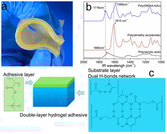 (a) Actual image of a DL hydrogel sample. The top adhesive layer was yellow-stained. (b) IR spectra of polyacrylic acid, poly(N,N-dimethyl acrylamide), and poly(DMAA-co-AA). (c) Schematic representation of dual hydrogen-bond networks.