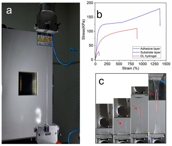 Mechanical properties of the hydrogels. (a) Photographs of a hydrogel under tensile test (v = 25 mm/min). (b) Tensile stress–strain curves of the AEtMA-Cl layer, substrate layer, and DL hydrogel as prepared. (c) Photographs of the hydrogel during a notch tensile test (v = 25 mm/min).