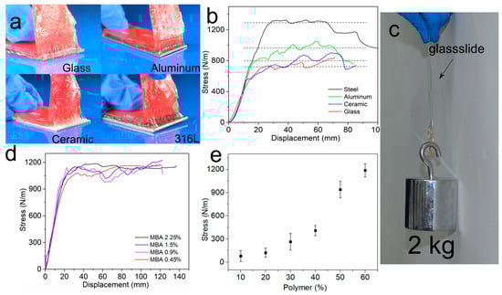 (a) Photos of the peeling process of the AEtMA-Cl-based layer physically attached on four solid substrates: glass, aluminum, Al2O3 ceramic, and 316L stainless steel. (b) Stress–displacement curves of the layer on the different surfaces. (c) Photograph of AEtMA-Cl-based hydrogel between two glass slides bearing a 2 kg load. (d,e) The adhesion of AEtMA-Cl hydrogels with different crosslinker contents and polymer concentrations by 90° peeling tests.