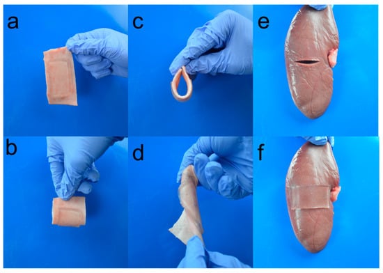 Photographs of the hydrogel bonded to pig skin (a) in the state of dangling, (b,c) being bent, and (d) twisted. Photographs of hydrogel adhesive adhered to pig kidney. (e) A notch was made in the pig kidney. (f) Hydrogel bonds to the pig kidney surface and connects the two sides.