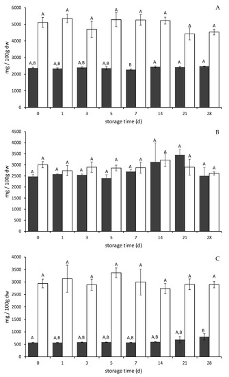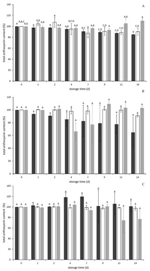 For chokeberry PP and bilberry PP, the storage experiment revealed a constant total anthocyanin content over 28 days of storage (Figure 2A,B, dark grey bars). The temporal changes during storage were not considerable.