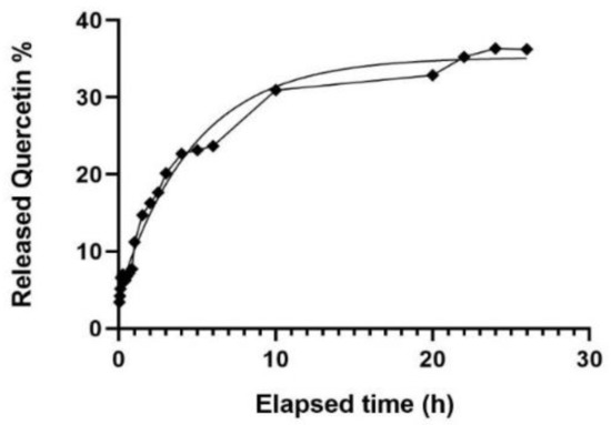 The release fits an exponential curve with equation Y = 35.22 ∗ (1 − exp(−0.2083×) (R2 = 0.9876). The total amount of Quercetin released through the membrane in the dissolution medium after 26 h is 36.7% of the total Quercetin used during the synthesis.