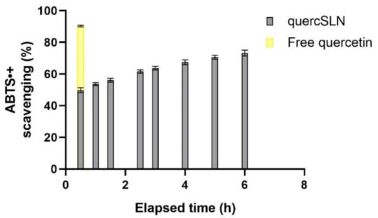 The absorbances of samples were measured at regular intervals within 6 h after preparation, with a total scavenging effect after 6 h of ≈73.0%. After 24 h the solution of Quercetin-loaded SLNs was completely discolored. The same test performed on 10 µL of a 1.6-mM Quercetin solution provided a 90.3 ± 0.5% scavenging effect after 30 min from sample preparation. This demonstrated the preserved antioxidant activity of Quercetin in QuercSLNs and its time-persistent effect due to a controlled release of the antioxidant molecule. The time-dependent behavior of the analyzed samples is reported in Figure 8.