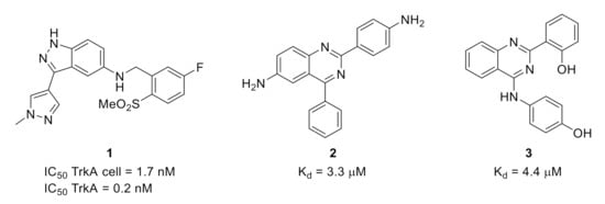 A structure-based virtual screening with homology-modeled protein structure has been used to identify new TrkA inhibitors such as quinazolines 2 and 3 (Figure 1) [].