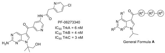 The use of a structure-based drug design process enabled the development by Pfizer group of clinical candidate PF-06273340 (Figure 2), a selective pan-Trk inhibitor with a limited brain availability to reduce side effects due to Trk inhibition in the central nervous system. The resolution of the X-ray cocrystal structure of PF-06273340 with TrkA revealed a DFG-out binding mode (PDB ID: 5JFX) []. This cocrystal structure was used in further chemoinformatic approaches to predict the binding affinity of a set of Trk inhibitors (General Formula A, Figure 2) using enhanced sampling of molecular dynamics with approximation of continuum solvent (ESMACS) and thermodynamic integration with enhanced sampling (TIES). The accuracy of calculated binding affinity of studied TrkA ligands suggested that this computational method could be successfully used in prospective ligand design [].