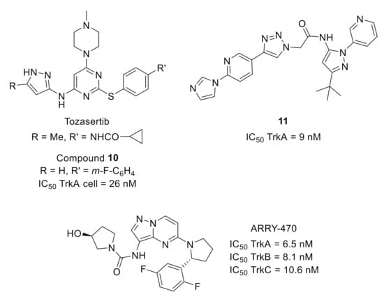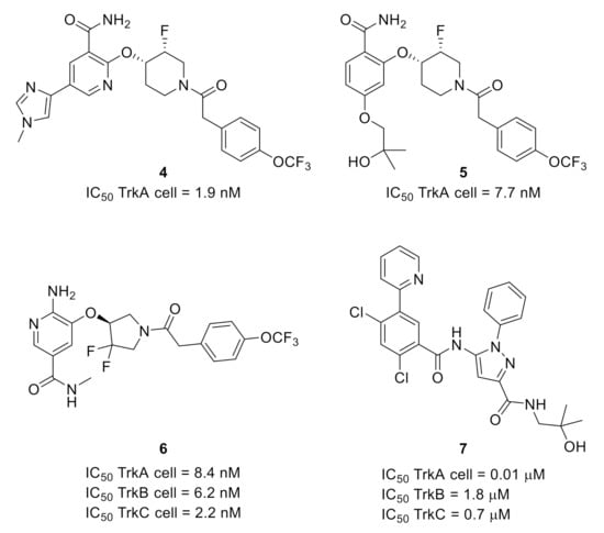 Due to the high homology of the ATP-binding site of the three isoforms, most of the ATP-competitive Trk inhibitors are equally active against the three isoforms. By studying an apo TrkA protein crystal structure, researchers from Pfizer noticed that, as previously mentioned, TrkA prefers to adopt a DFG-out autoinhibitory conformation. These structural features were the starting point of a work dedicated to the development of allosteric Trk inhibitors. The most potent compound was pyrazolecarboxamide 7 (Figure 3), targeting an allosteric pocket located behind the ATP-binding site. Compound 7, exhibiting a selectivity in favor of TrkA versus TrkB and TrkC, is orally bioavailable and demonstrated an interesting profile in preclinical pain models [].