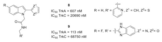 A design and structure–activity relationship (SAR) process was based on the cocrystal structure of indole 8 with TrkA (PDB ID: 5KMJ). This structure underlined the role of the residues 440–497 from the juxtamembrane region in the selectivity between the three isoforms [] and led to the synthesis of analog 9 with a better TrkA inhibitory potency and an improved selectivity vs. TrkC (Figure 4) [].
